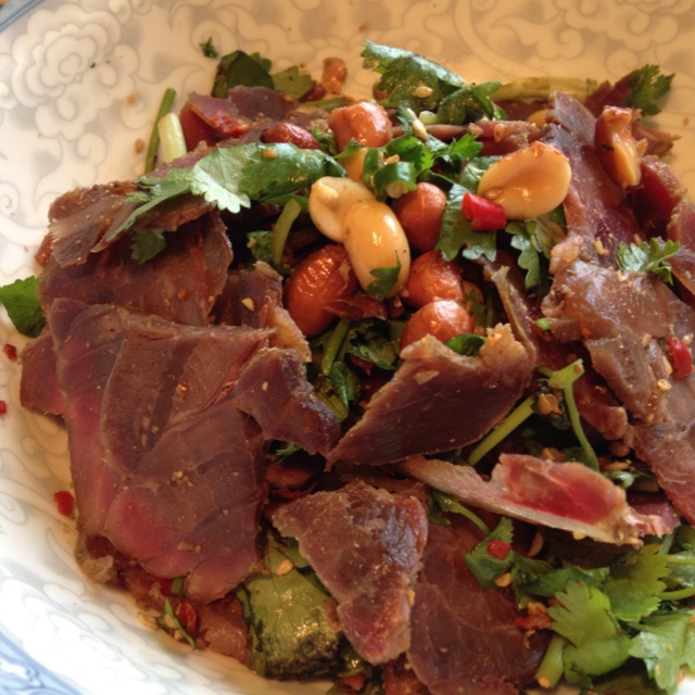 用我们这边一种叫盐边牛肉的方法拌的,大量的香菜,小米辣,花生是特色,又干又辣又香!