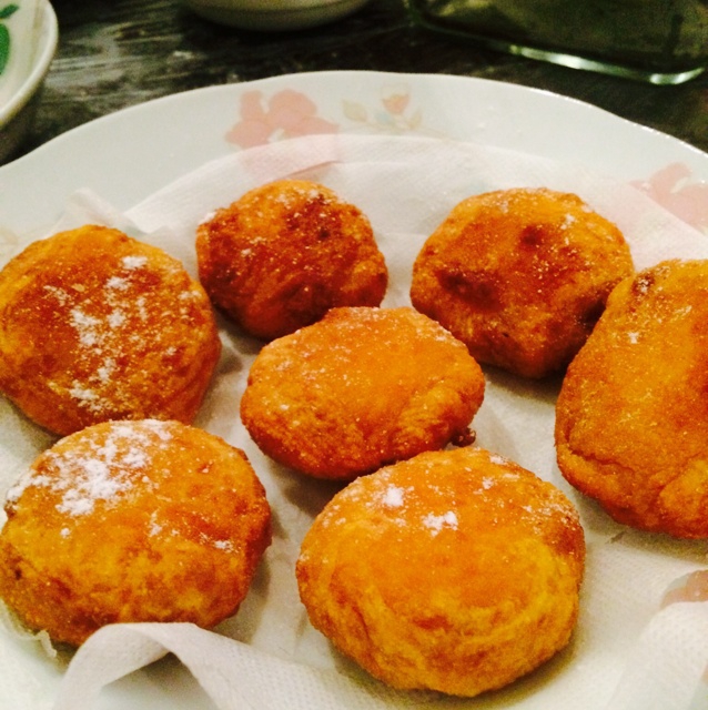发现家里糯米粉用完了!放了高筋面粉和低筋面粉,比例不详。最后因为不够甜撒了糖粉。味道很好。2013收官作,满意。
