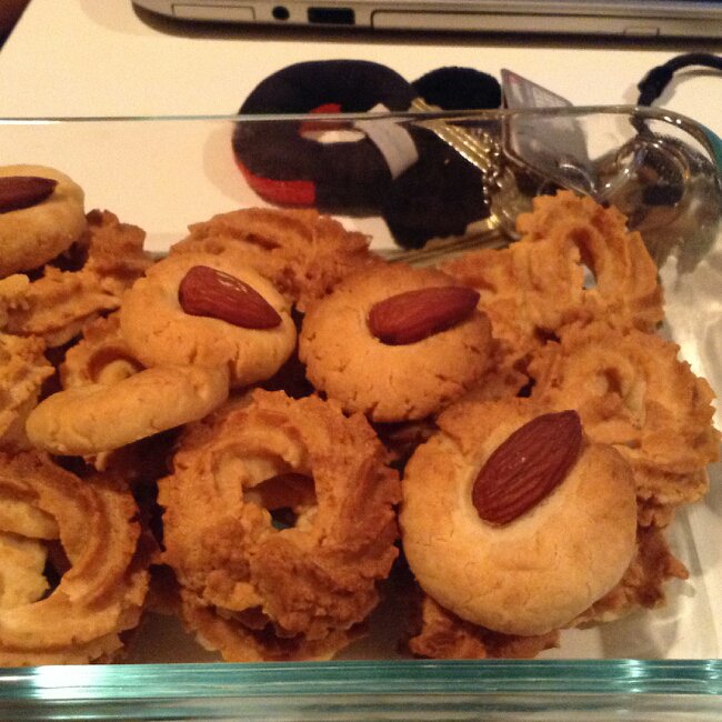 裱花有点干~纹络比较。。哎哎~后来wilton的裱花袋被挤坏了。就做了几个圆形加杏仁的。感觉也很好吃!脆脆的。没有电子秤。只好用量勺做计量。下次多糖!