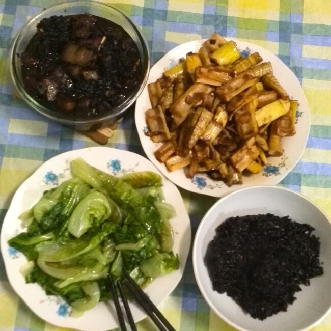 梅干菜红烧肉,清炒生菜,油闷笋,黑米饭,有蔬菜有肉有纤维有杂粮