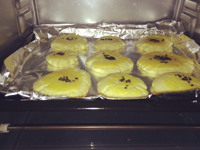 宫廷桃酥正在烤制中~色泽真美腻~香飘四溢~顶上撒了点芝麻~