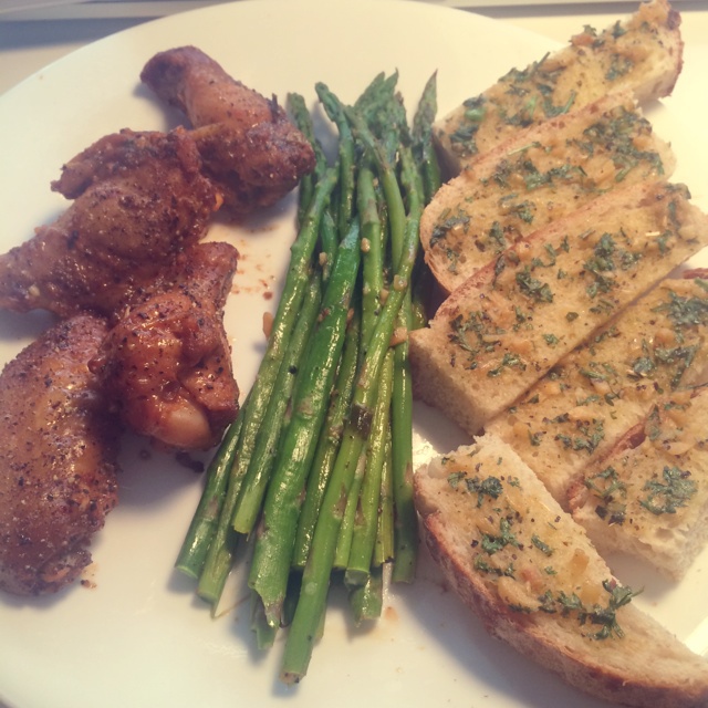 RRhina 做过 晚餐•2014年10月29日 烤箱版一锅出~自制新奥尔良料腌的鸡翅棒呆~加上烤芦笋和蒜香面包,与一杯自制港式冻奶,快手又美味~ #晚餐•2014年10月29日# 2014-10-30