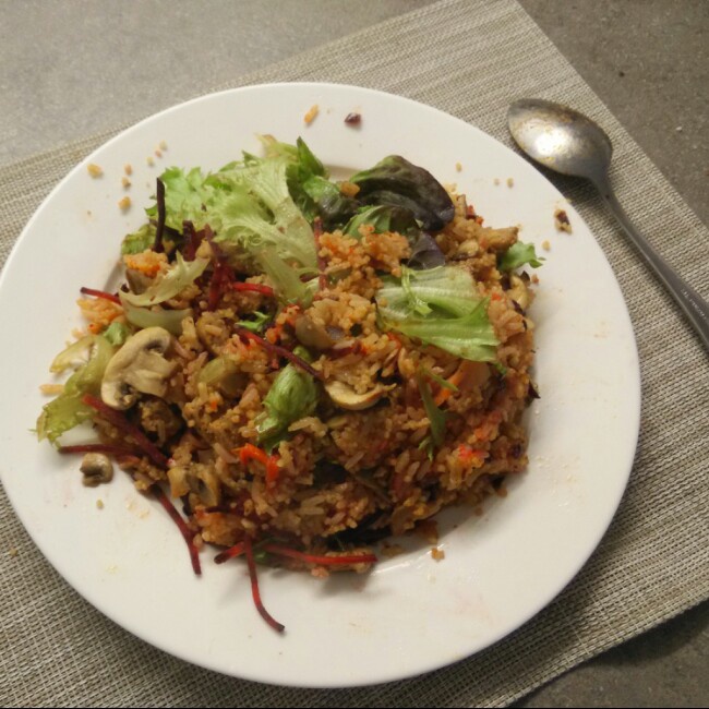 狸呗 做过 午餐•2014年11月14日 #午餐•2014年11月14日#超大份一人食。洋葱,蒜,香肠,蘑菇,cherry tomato,cheese,大米夹小米,生菜,甜菜根,扯了点三文鱼。韩式辣酱,柠檬汁,黑胡椒。 2014-11-14