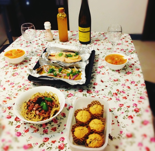 国王_小懿 做过 美食.与爱 #不凹造型会死星人#【美食】昨天晚上的生日大餐~杂菜汤是爸爸拿手好菜,麦芬是早上做的。晚上烤了三文鱼扒和鸡扒,炒了培根橄榄菜意大利面,做了水果茶;一个小时便可以吃了~简单又丰富~ #晚餐•2015年1月26日# 2015-01-26