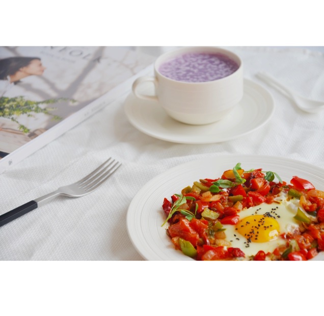 祖祖祖小旋 做过 【终极烹饪课程】北非蛋 2015·03·28 昨晚买了新鲜的紫薯 做了想喝很久了的紫薯牛奶 还有新尝试的 北非蛋 鸡蛋很嫩 每一口都混合着番茄甜椒的好味道 早安 周末。 #早餐•2015年3月28日# 2015-03-28