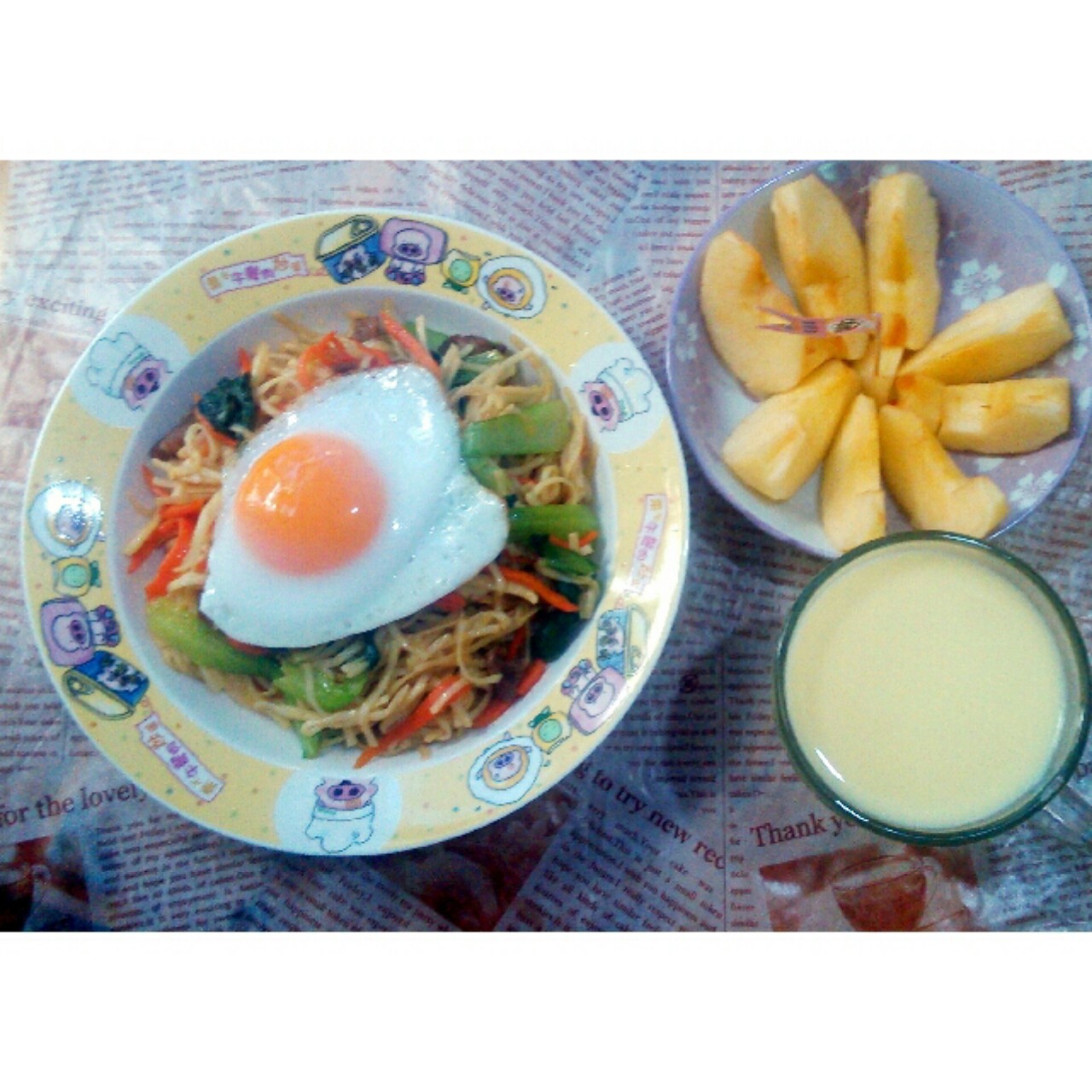 早餐之炒面,煎鸡蛋,奶香玉米汁,水果...
