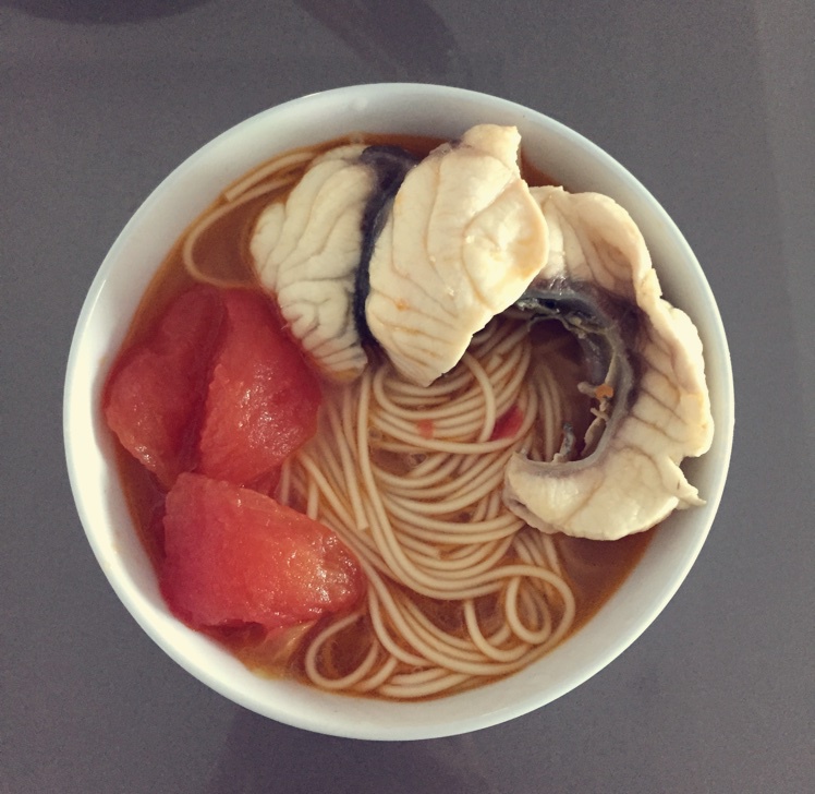 一个人的午餐~脆皖鱼番茄面~家里没香菜和葱~撒点更好吃~