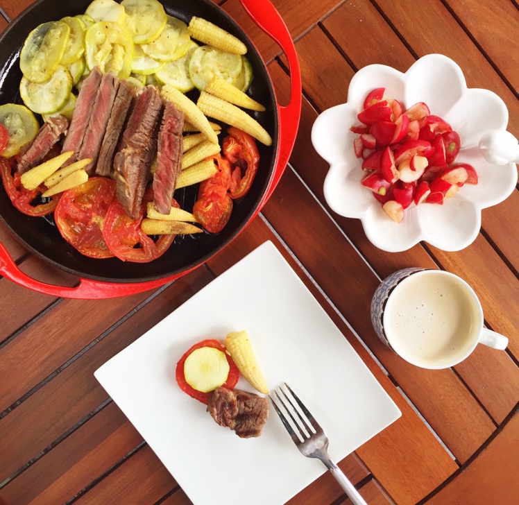 烤蔬菜、牛排、凉拌水萝卜,拿铁。