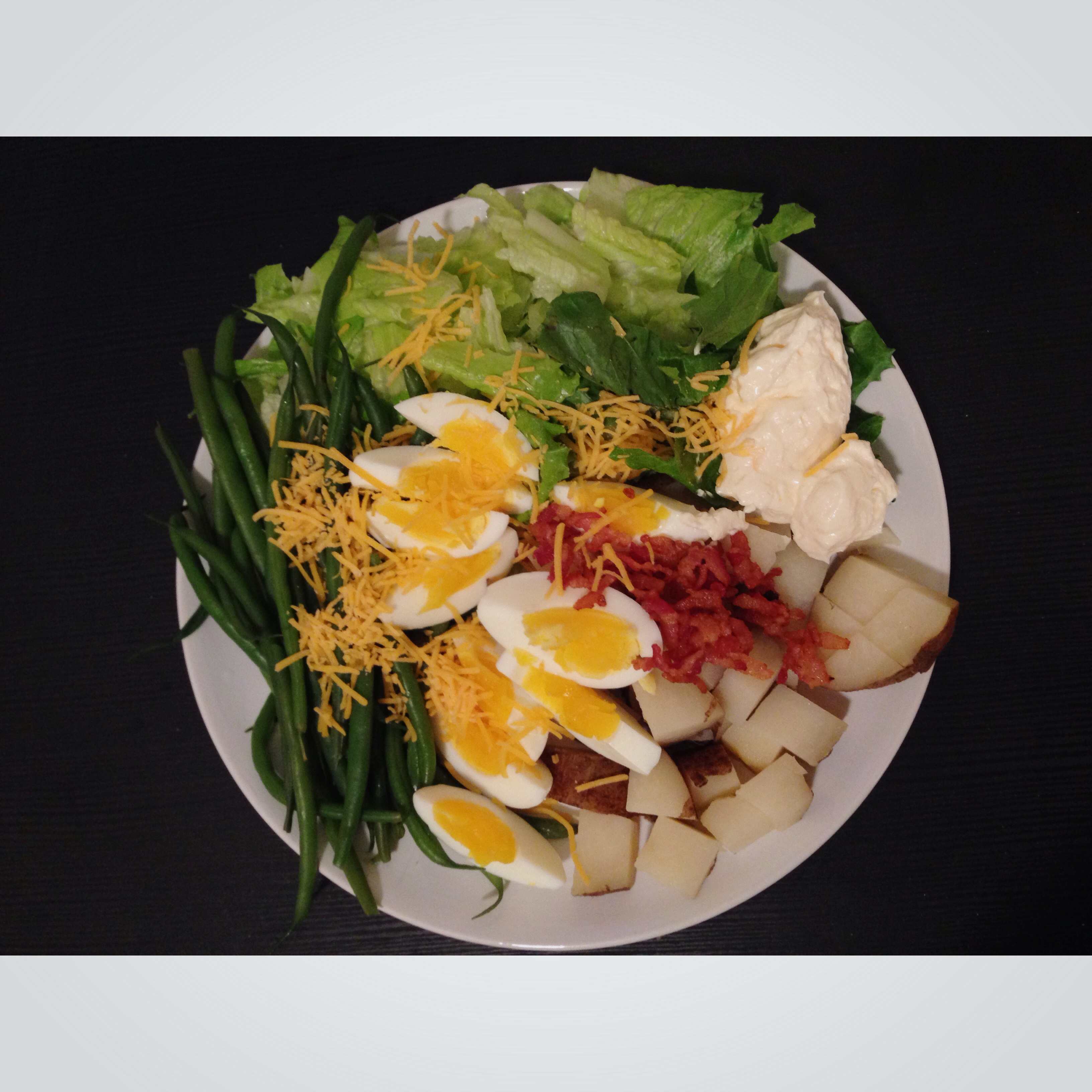 毯妈 做过 晚餐•2015年9月15日 满足感超强!超级简单无技巧的烤土豆田园沙拉!中午烤风琴土豆培根多烤了一个大土豆!晚上连皮直接切成块!加上煮的半糖心蛋!培根碎!奶酪碎!生菜和甜豆角!再来上一勺蛋黄酱!太满足了!!!!!营养又健康!想要热量少一点的可以选择低脂素蛋黄酱哦~ #晚餐•2015年9月15日# 2015-09-16