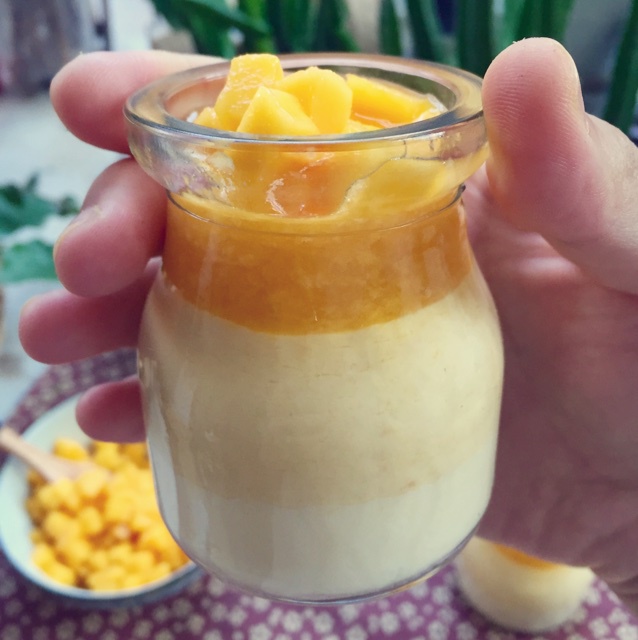 做了三个颜色。最下面是奶和奶油,中间Mix了芒果泥,最上面是纯芒果加芒果丁。