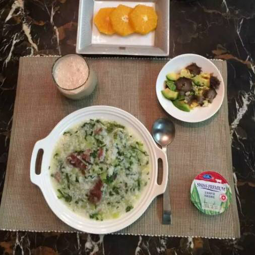 lynn_shcn 做过 早餐•2015年10月29日 一夜雨落得淅沥,屋外还是朦朦胧胧。昨儿再累,一觉下来,力气又回来了。牛肉青菜粥,牛油果拌海参,石榴汁,酸奶,橙。粥配小菜,小菜品,大色艺。 #早餐•2015年10月29日##Lynn家早餐##牛油果# 2015-10-29