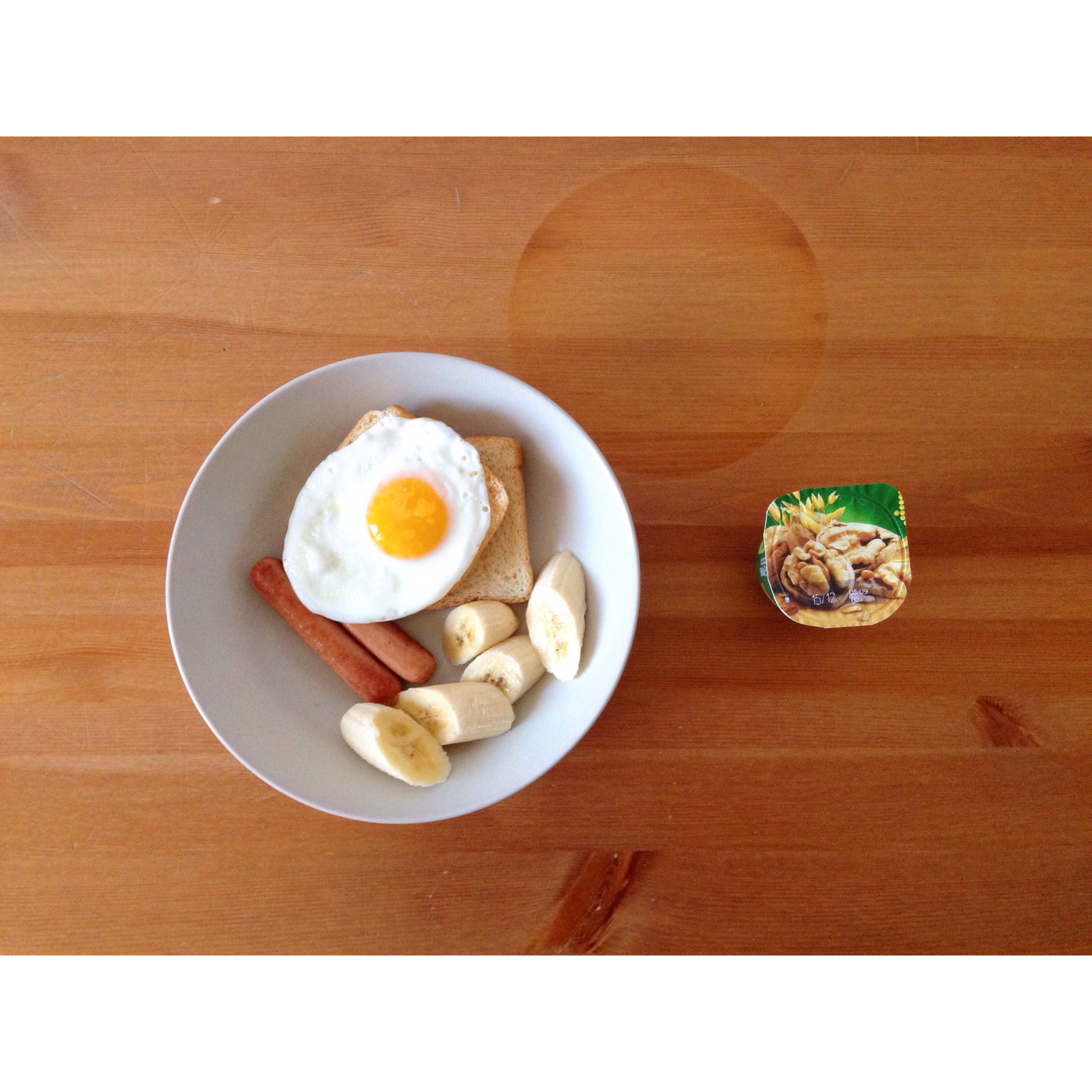 2015.11.22 煎蛋+吐司+煎香肠+香蕉+酸奶 好久没做全套早餐啦~吃饱开始学习了w