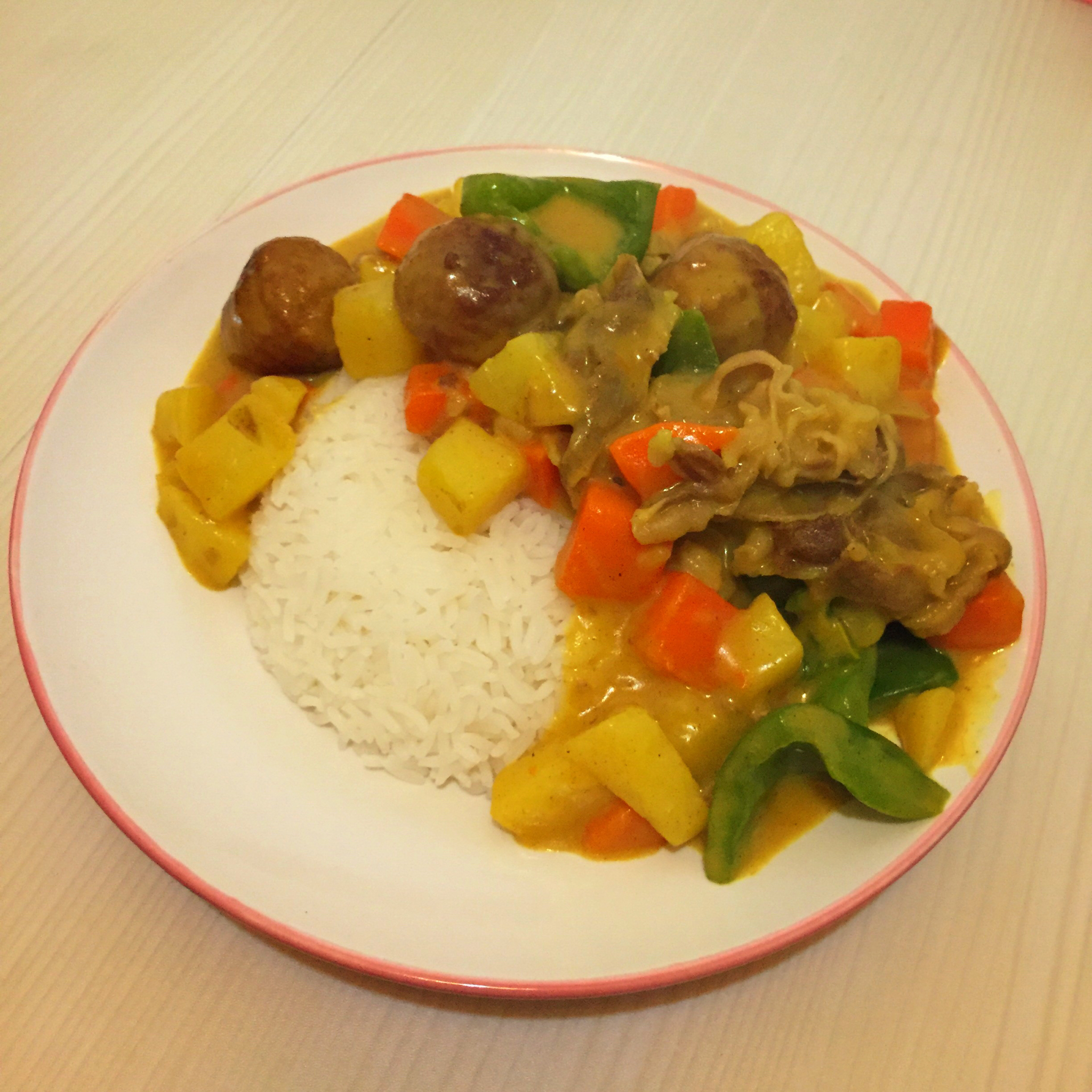 咖喱肉丸肥牛,肉丸是宜家买的瑞士肉丸,咖喱是用的咖喱块,烹饪过程中加牛奶代替水会更浓郁噢!