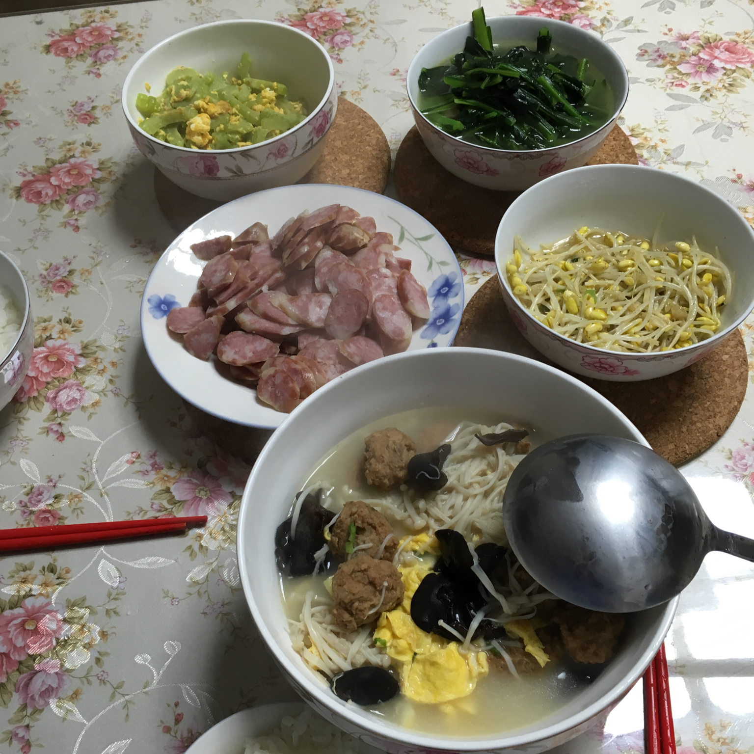 今天的晚餐,苦瓜炒蛋,炒豆芽,香肠,炒青菜,肉丸黑木耳金针菇蛋皮汤。做饭技术又提高了。