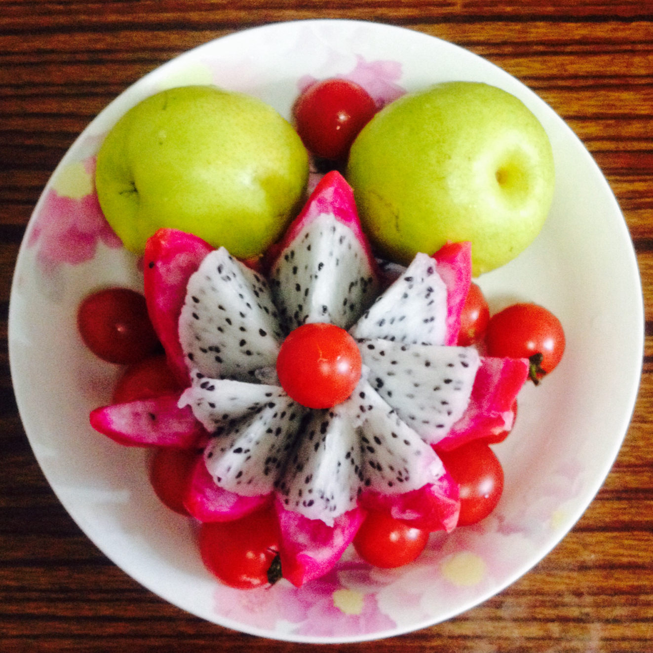 我家大乐餐餐不离水果之:火龙果圣女果and新疆香梨。