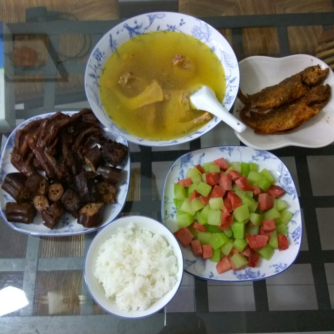 莴笋炒肉丁+酱鸭爪+糖醋小黄鱼+鸽子汤