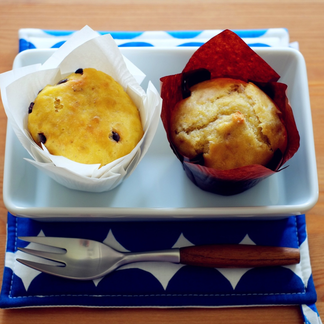 一样的量做了右边的香蕉核桃麦芬,两倍的量做了左边的香蕉巧克力麦芬,口感是发糕那种略粗糙的口感,略带酸味,不会觉得突兀。
