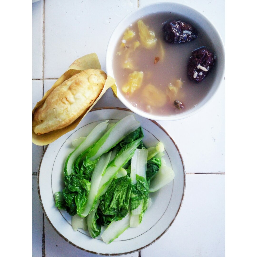 菠萝玫瑰红枣粥+炒青菜+红糖锅盔。一个人的晚餐