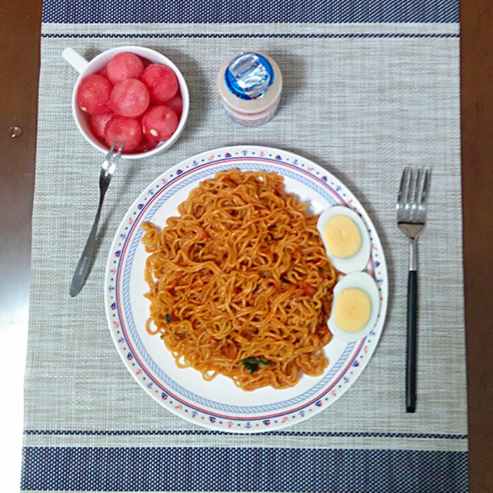 今天孩子的早餐 农心辣白菜拌面 白煮蛋 养乐多 西瓜