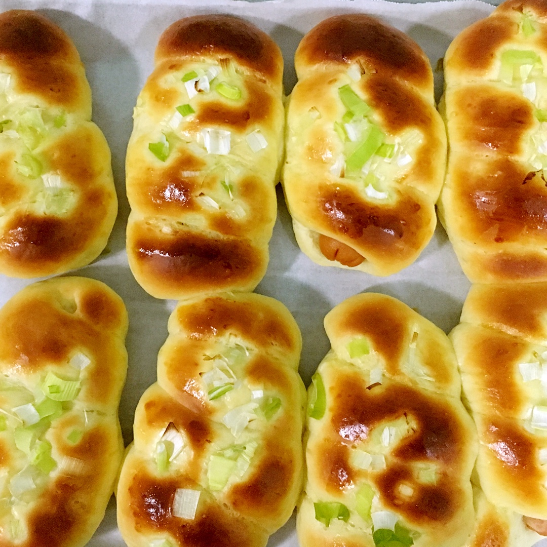 火腿肠太大只截成两半用,所以做的是“短腿包”。刷了蛋液临时撒了一些包饺子剩的大葱碎,出奇滴美味哦!