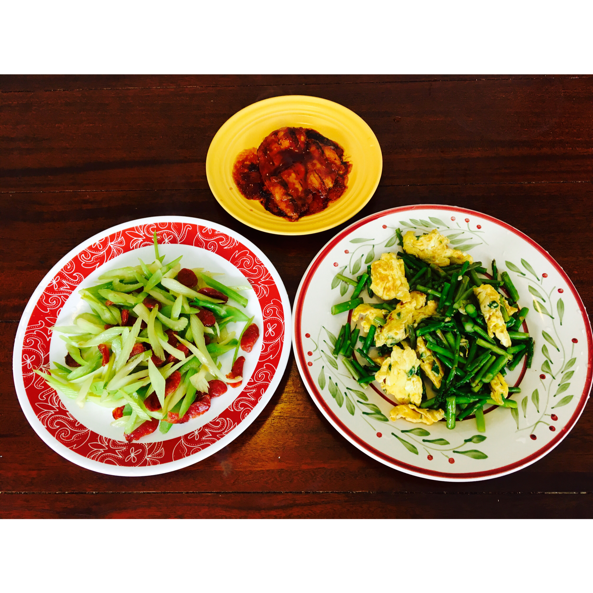 小茄子_0807 做过 晚餐•2016年5月11日 腊肠炒香芹,芦笋炒鸡蛋,teriyaki chicken这张照片传了三天都没传上去…… #晚餐•2016年5月11日##康村小日子# 2016-05-11