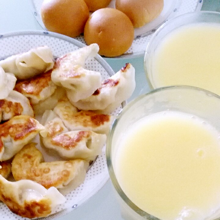早餐吃煎饺,面包,玉米汁