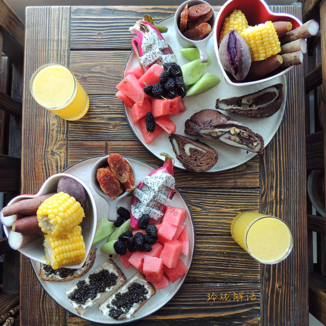 可可麻薯软欧,鲟鱼籽吐司,玉米,山药,红薯,紫薯,川味腊肠,水果,鲜榨柠檬、梨、菠萝汁!
