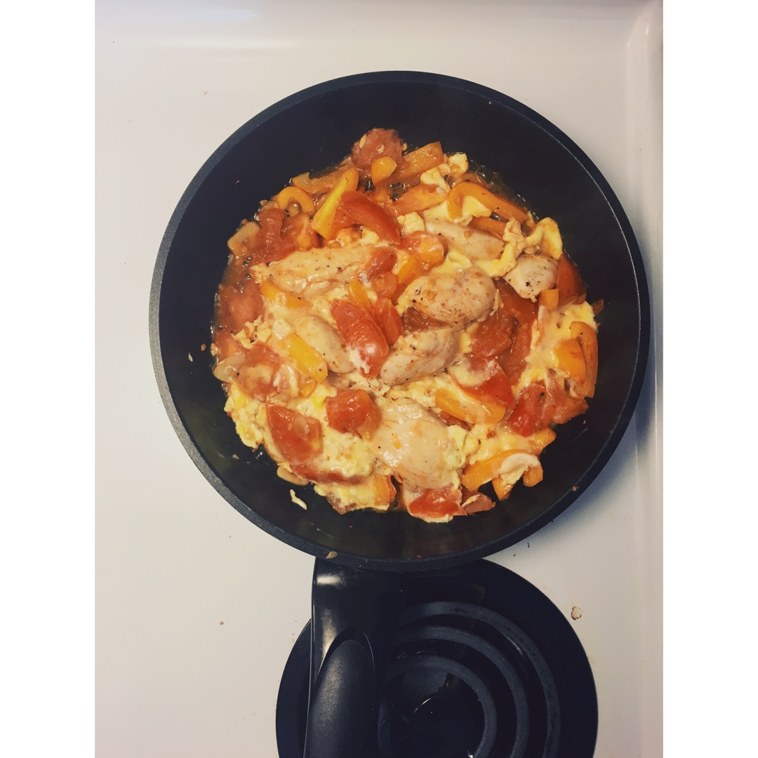 Millyhhhhhan 做过 番茄炖鸡胸丨健康·三餐 两个番茄半个黄彩椒 一锅都是鲜红色鸡胸肉一开始不用煎熟,断个生就好了加了点番茄酱 #午餐•2016年5月22日##减肥是生活方式# 2016-05-23