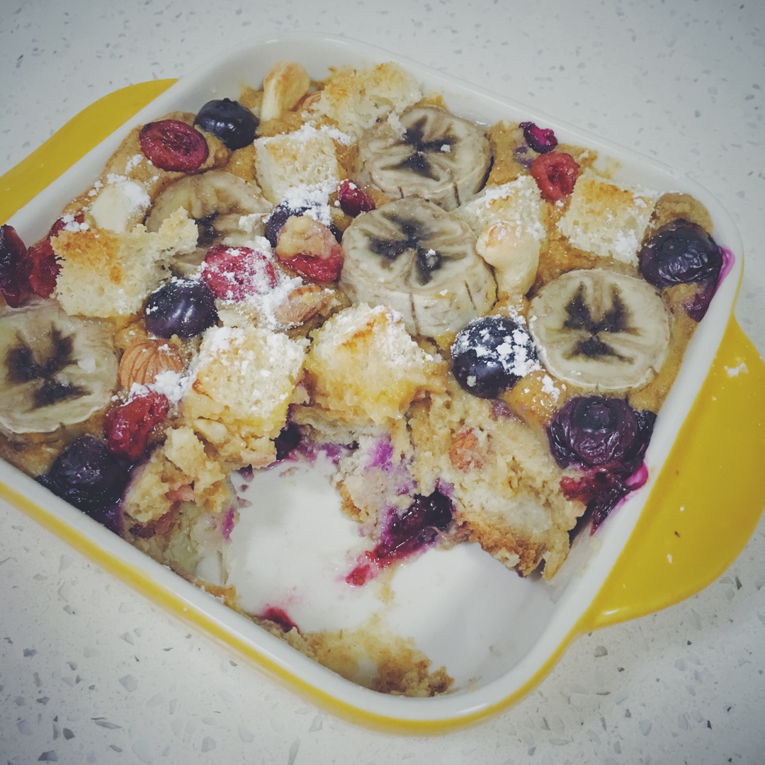 weetbix泡入牛奶成糊状,鸡蛋用打蛋器打散(可以加少许糖)倒入麦片糊,杏仁和腰果各6个(剩下的几个整颗的坚果放在表面比较好看)用保鲜袋和擀面杖碾碎拌进麦片蛋奶糊,大列巴切丁,香蕉切片,烤碗底下铺满香蕉片、吐司丁、蓝莓,倒入麦片蛋奶坚果糊,用小勺子抹平,再把剩下的香蕉片、蓝莓、整个的坚果、吐司(表面的吐司和埋在底下的是不同的口感,表面的会是脆脆的)和蔓越莓干按自己喜好摆在表面,摆不完的就吃掉吧!哈哈哈,然后烤箱中层180度烤20分钟!叮!健身餐开吃!!!