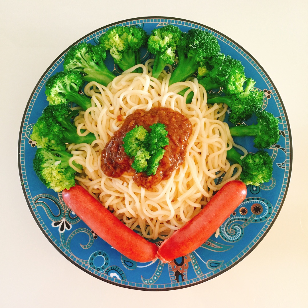 咖喱意面配烤肠和西兰花,一大早就有食欲和营养。