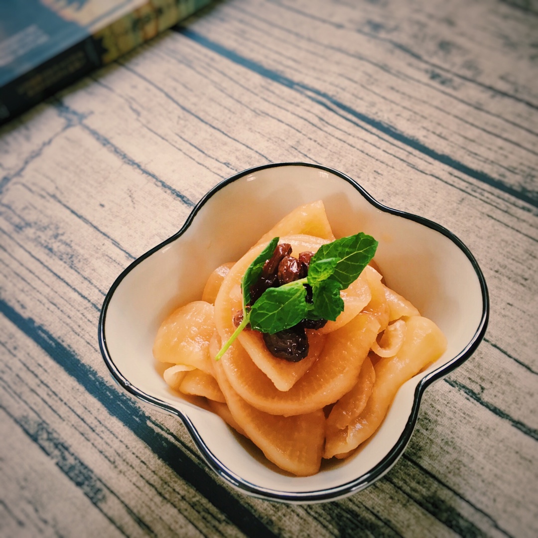 用苹果醋取代白醋,水克菲尔取代水,减少糖量。成品颇清爽,是极适合夏天的餐前小食。加了酒浸葡萄干和薄荷增加味道层次。