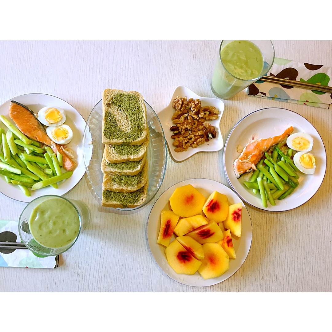 牛油果奶昔,煎三文鱼,芦笋,核桃,白煮蛋,抹茶小麦胚芽吐司面包,大油桃