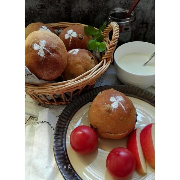 #早餐•2016年9月18日##向日葵的手作面包#黑麦蓝莓松仁餐包。自己拼凑的方子,感觉还不错。记录:酸奶波兰酵头100g(50g中粉),面包粉175g,俄罗斯黑麦25g,鸡蛋一枚50g,红糖25g,水80g左右,耐高糖酵母2g,盐2g,植物油5g,蓝莓干,松仁随手抓,各一把。水预留30g ,混匀除果料外的其它材料,分次将剩下的水慢慢揉进面团里,用拉面师傅的手法将面团进行摔扯到出有韧性的薄膜。我是一边看《尼基塔》一边摔的,所以不觉得时间难熬😂。出膜后再混合果料发酵。葵花籽看到我用小刀刻的三叶草筛粉图案,问我为什么不刻四片叶子,因为四叶的花语才代表幸福,三叶是代表爱情……。我连忙度了一下,感觉汗珠子要掉下来了!他也给我剪了一个钱袋图 ,说希望我发财,幸运😂