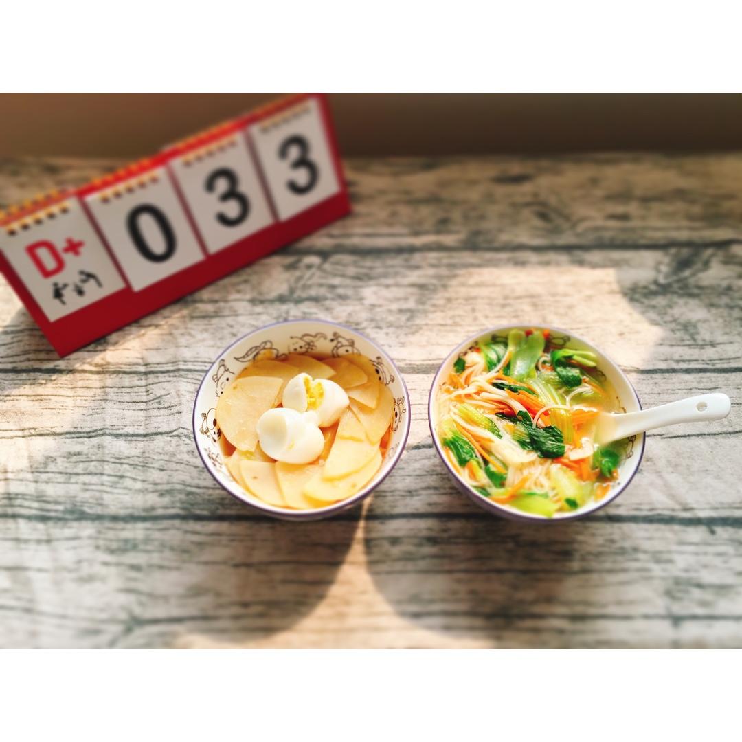 移植后第33天午餐:胡萝卜青菜面+酱烧土豆片+鸽子蛋2枚