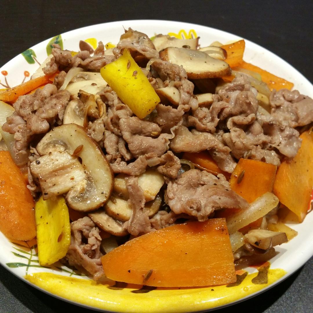 #午餐•2016年12月1日##开饭啦饼星人#饼星人的午餐,饼星人的午餐,饼星人的午餐。孜然羊肉卷。今天回来晚了12点才开始炒菜。幸好饼星人开会也晚回来了几分钟,所以刚好赶上开饭。今天他没敢扔菜,胡萝卜蘑菇洋葱都乖乖吃得一干二净,一来是因为上午没给他带零食,开会开饿啦。二来是本来就菜多肉少,再挑他就真得吃白米饭啦。三来乖乖听话下午才能得到牛肉干😄看来“饿着他”,“没得选”和“悬赏”是逼他吃菜的三大法宝😉下午给他带牛肉干和水果,午饭吃得少,这两天都是四点多就开始饿了。昨天他说晚上九点半他去楼下餐厅拿餐具准备吃我给他带的水果时,发现他们老板孤零零一个人凄凄惨惨在吃食堂的剩饭,于是深深体会到有我照顾是多么幸福😀然而给我买零食和拍喵屁并没有什么用,今天还是1 oz 牛肉干,只不过拣小块儿的,显得多几块而已。饼星人终究是斗不过我们喵星人呀😄