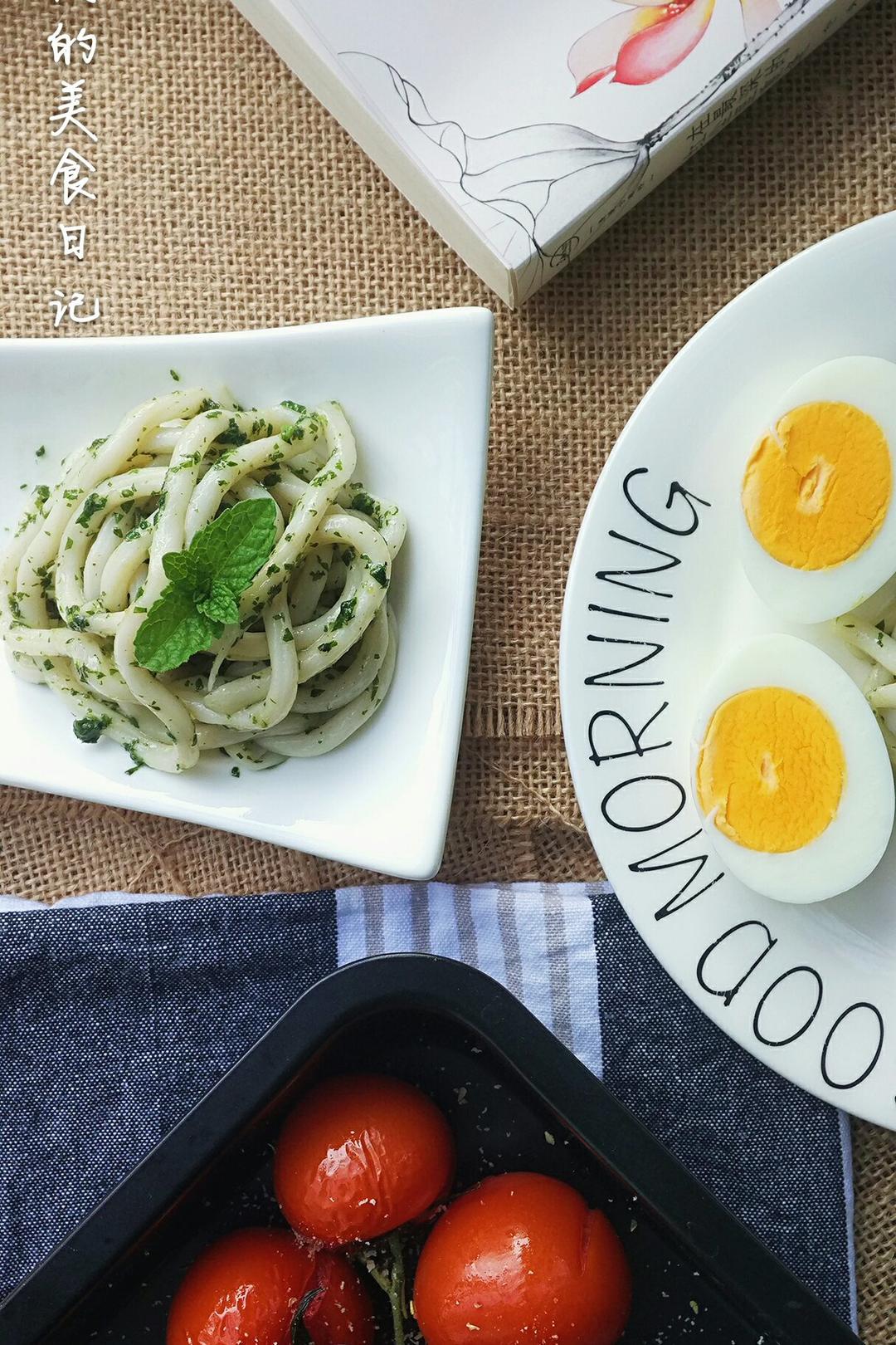 #早餐•2017年4月30日##公号:流岚的川菜美食日记#买了乌冬面,一早去采薄荷,手划过混生的酸酸草,细长的果实爆溅开来,细细的籽飞溅出来,撒落在薄荷叶上,发出细微的声音,种子落在叶上的声音,然后溅到土里,那是一种属于早上的快乐的声音