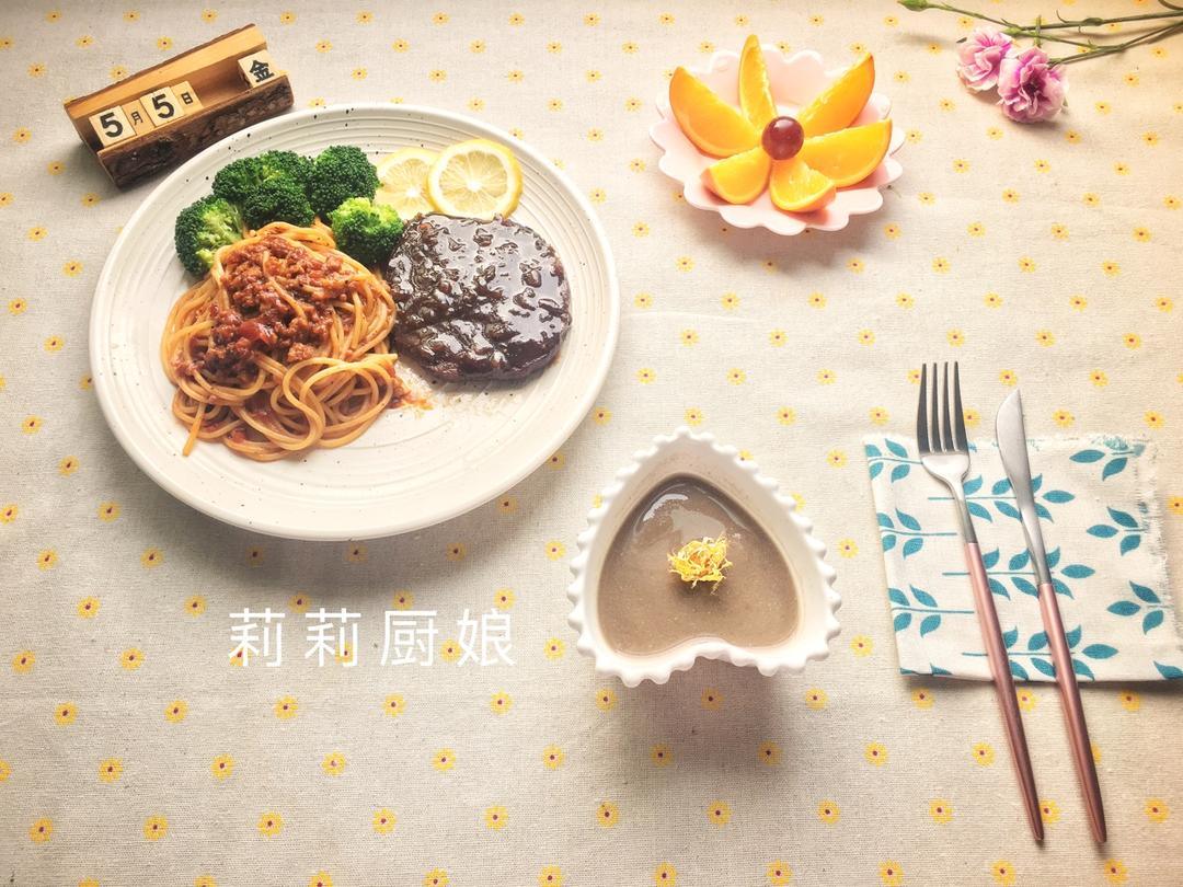 159五谷杂粮粥+肉酱意面+黑椒牛排+橙子🍊