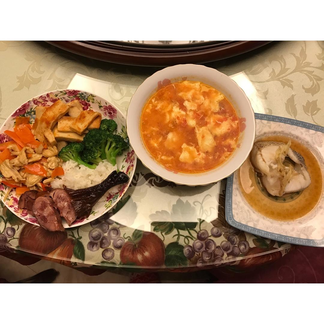 鸡胸肉胡萝卜、茄汁干锅豆腐、西兰花、蜜汁酱鸭、蒸银鳕鱼、番茄蛋汤