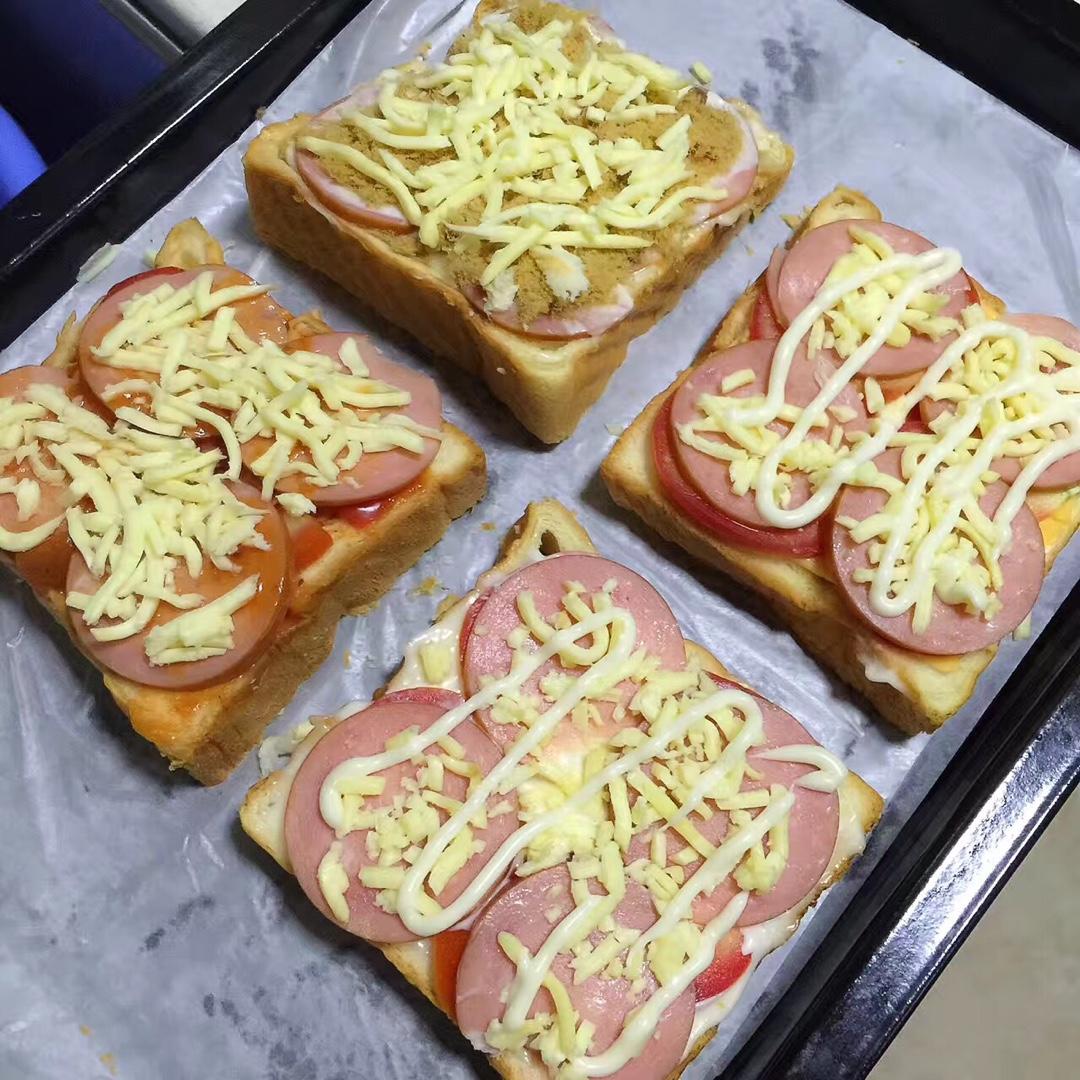 PENNY是新手 做过 一片面包的三明治 做了四个口味:芝士火腿黑椒,沙拉肉松火腿,沙拉火腿蛋,奶酪火腿。胡乱搭配,味道却出奇好吃。用烤炉180度烤了15分钟后再加多片面包盖上,切成三角形。 #早餐•2017年6月13日# 2017-06-13