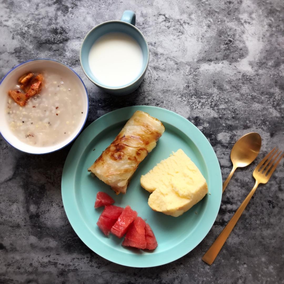 MiNt芝芝 做过 早餐•2017年6月14日 鸡蛋手抓饼裹香肠~芝士戚风~杂粮粥+牛奶+西柚~马上要考试了,我比小的压力大🤣 #早餐•2017年6月14日##❤幸福的事❤##芝芝爱心餐# 2017-06-14