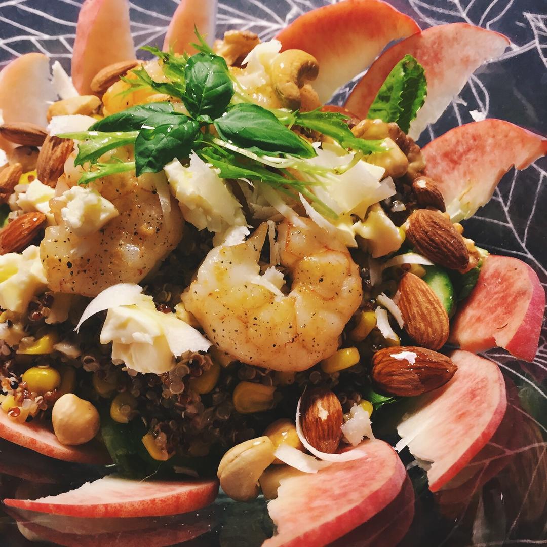长耳朵猫 做过 藜麦减脂沙拉【混搭终结篇】 罗马生菜+意大利生菜+乳黄瓜打底中间是鸡汤煮的藜麦和玉米粒水果配了半个新上市的水蜜桃切片toppin是阿根廷红虾和一把坚果,再制三角奶酪+帕玛森干酪丝点缀,橄榄油醋汁调味,棒极了! #午餐•2017年7月20日##接力自制幸福感##给你力量的食物# 2017-07-20