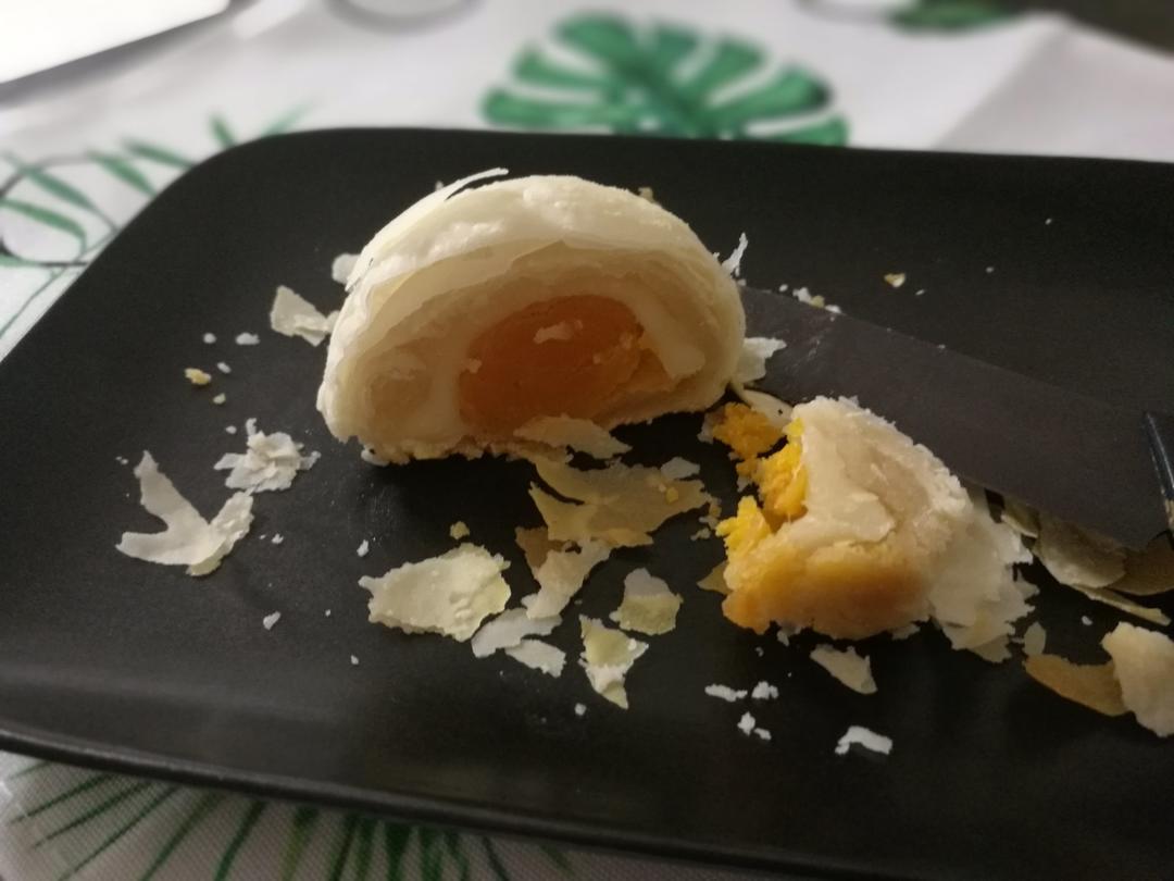面粉的吸水性不一样,几乎没有用到冷水的量。自作主张加了一层麻糬,好大的馅,好酥的皮,吃得直掉渣😆