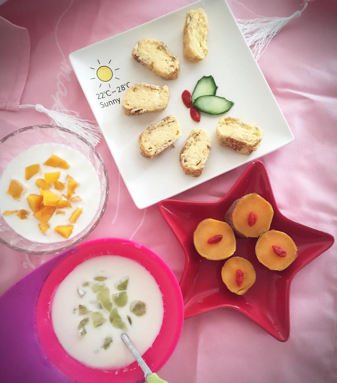 玉子烧、蒸地瓜、芒果酸奶、提子酸奶