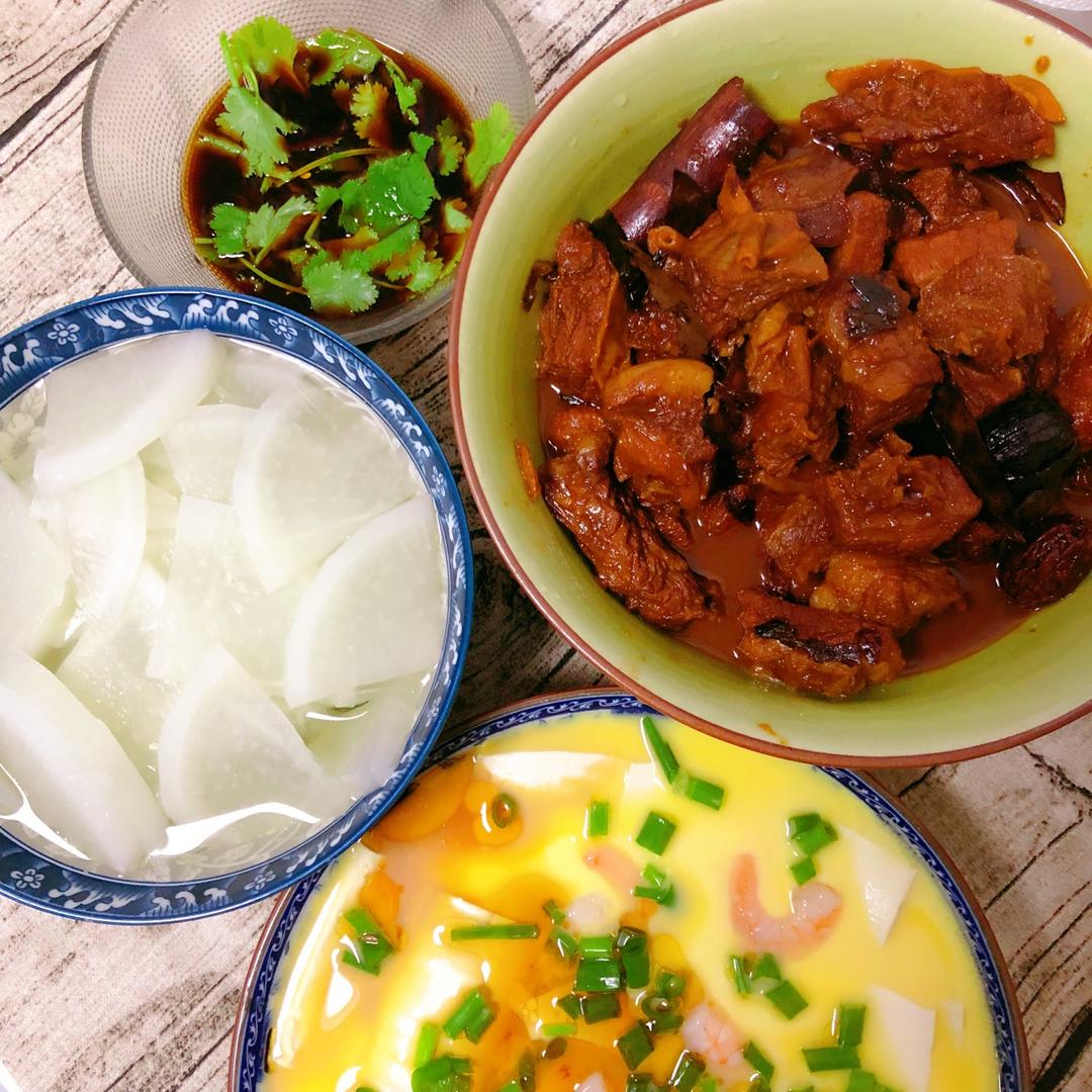黄焖牛肉,虾仁豆腐蒸蛋,泉水煮萝卜