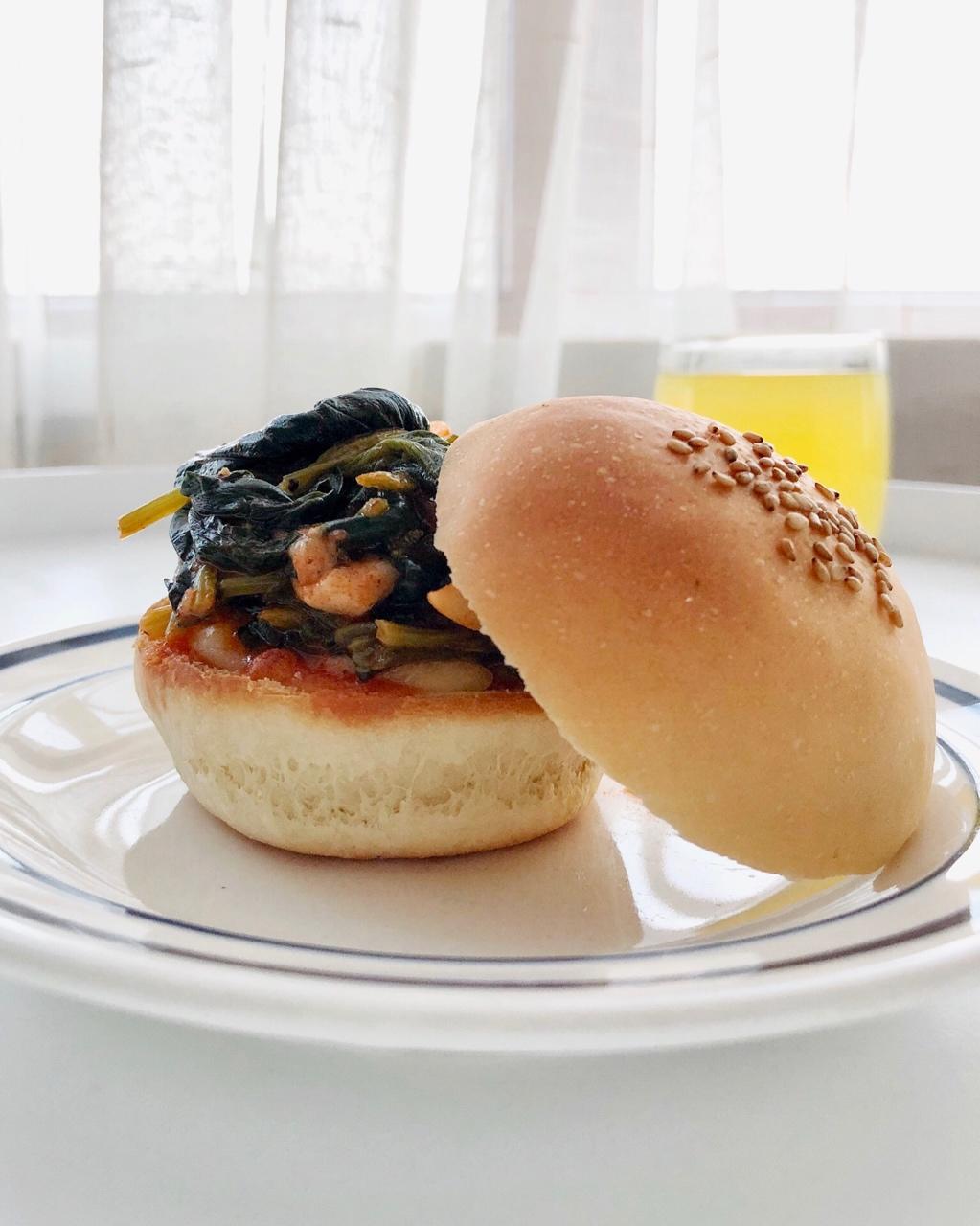 iamEsther 做过 2018年02月01日 010 . 香辣菠菜焗汉堡,橙汁。/ 2.1早安!我的汤汁有点多,其中被饼胚吸收了一部分,再收下汤汁会更好。胖豆这是在哪? #早餐•2018年2月1日##Esther的365食光##Esther的三明治托管所# 2018-02-01