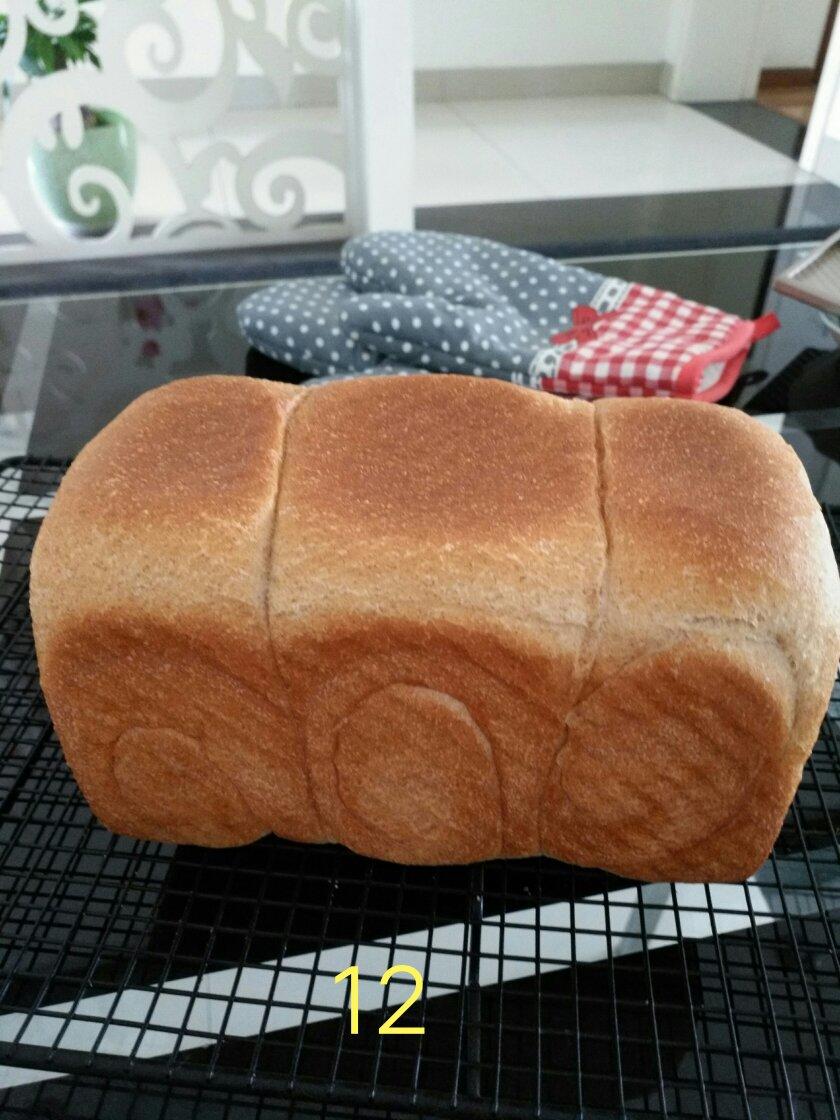 还是高粉。还是有黑麦。减少了面粉的份量。加了鸡蛋。终于涨至平顶了。175℃.35分钟。温度稍高了点。下次再试试看。