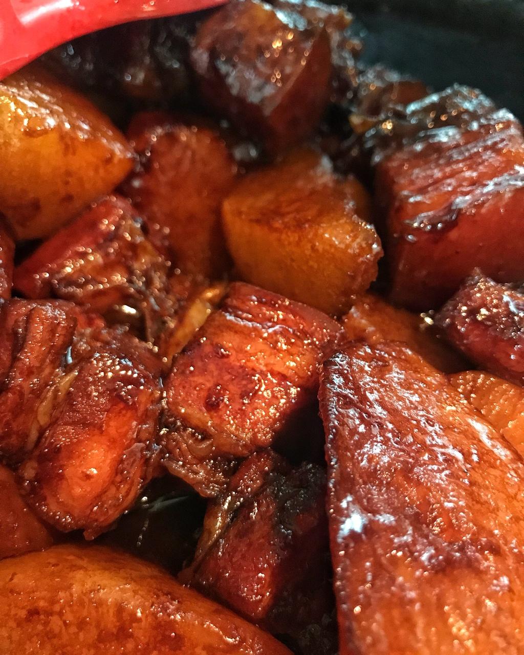 燉煮時間60分鐘,感覺還可以再多20分鐘更軟糯!買的五花肉比較瘦,離皮最遠的瘦肉部分很柴,但夾在肥肉里的瘦肉不柴,很香。以後考慮切去部分瘦肉再燉煮。味道方面用的李錦記生抽,兩湯勺,一湯勺老抽,冰糖30g,甜度剛好,不夠鹹,(也許我加的蘿蔔比較多)收汁加了鹽,其他都還好。蘿蔔在燉煮20分鐘後就加入,煮了40分鐘,入口即化,好吃!謝謝黃博士的分享!