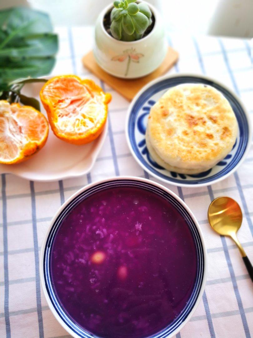 今日早餐银杏果紫薯粥,韭菜馅饼