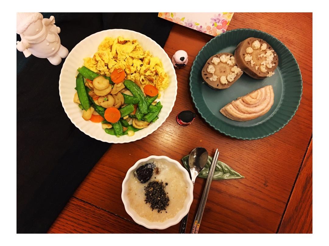 姜姜姜小糖apple 做过 美食每刻 #美食每刻#周五,早上好!今日早餐:滑蛋+荷兰豆炒杏鲍菇,糯米藕+花卷,粥#张爱玲说:娶了红玫瑰,久而久之,红玫瑰就变成了墙上的一抹蚊子血,白玫瑰还是“床前明月光”;娶了白玫瑰,白玫瑰就是衣服上的一粒饭渣子,红的还是心口上的一颗朱砂痣。# #早餐•2018年4月27日# 2018-04-27
