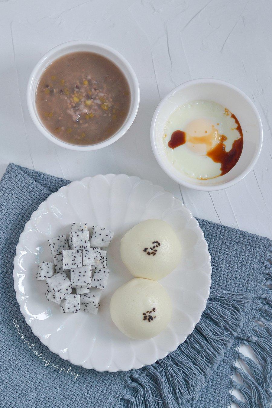 杂粮粥+蒸蛋+芝麻包+火龙果。